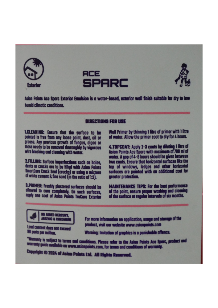 A water based acrylic binder exterior emulsion which is suitable for moderately humid climatic conditions. Ace Sparc's weather guard properties resist chalking, cracking, and weathering as opposed to distempers & cement paints. With this exterior paint, get plastic paint-like finish which lasts longer than distemper. Asian Paints Sparc is a water-based acrylic exterior emulsion suitable for dry to moderately humid climatic conditions.