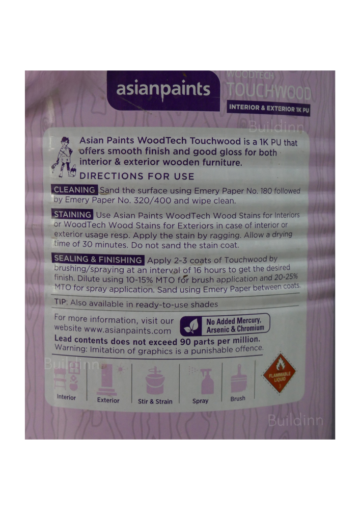 An effortless application with good hardness makes this finish better compared to the local French polish. The application process of WoodTech Touchwood does not require a separate sealer coat. The same material can be applied as undercoat and topcoat, hence it proves to be an economically beneficial choice. WoodTech Touchwood 1KPU is a polyurethane coating designed for both interior and exterior wood surfaces. It offers superior gloss, excellent durability, and low VOC emissions. With easy application and strong weather resistance, it's ideal for improving and protecting furniture with a beautiful, long-lasting finish.