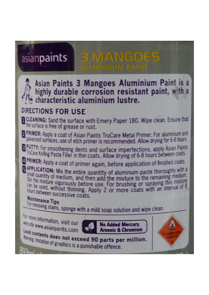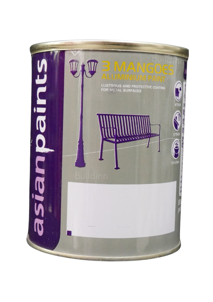 3mangoes aluminium paint is a 2 pack silver paint. Which comes in a big box with two different boxes in it. One is clear and other is silver paste, paste should be mixed with clear before applying on the surface. It is a oil based paint which has to be diluted with 200ml of turpentine. It can be applied on metal, wood, wall, iron, stones etc