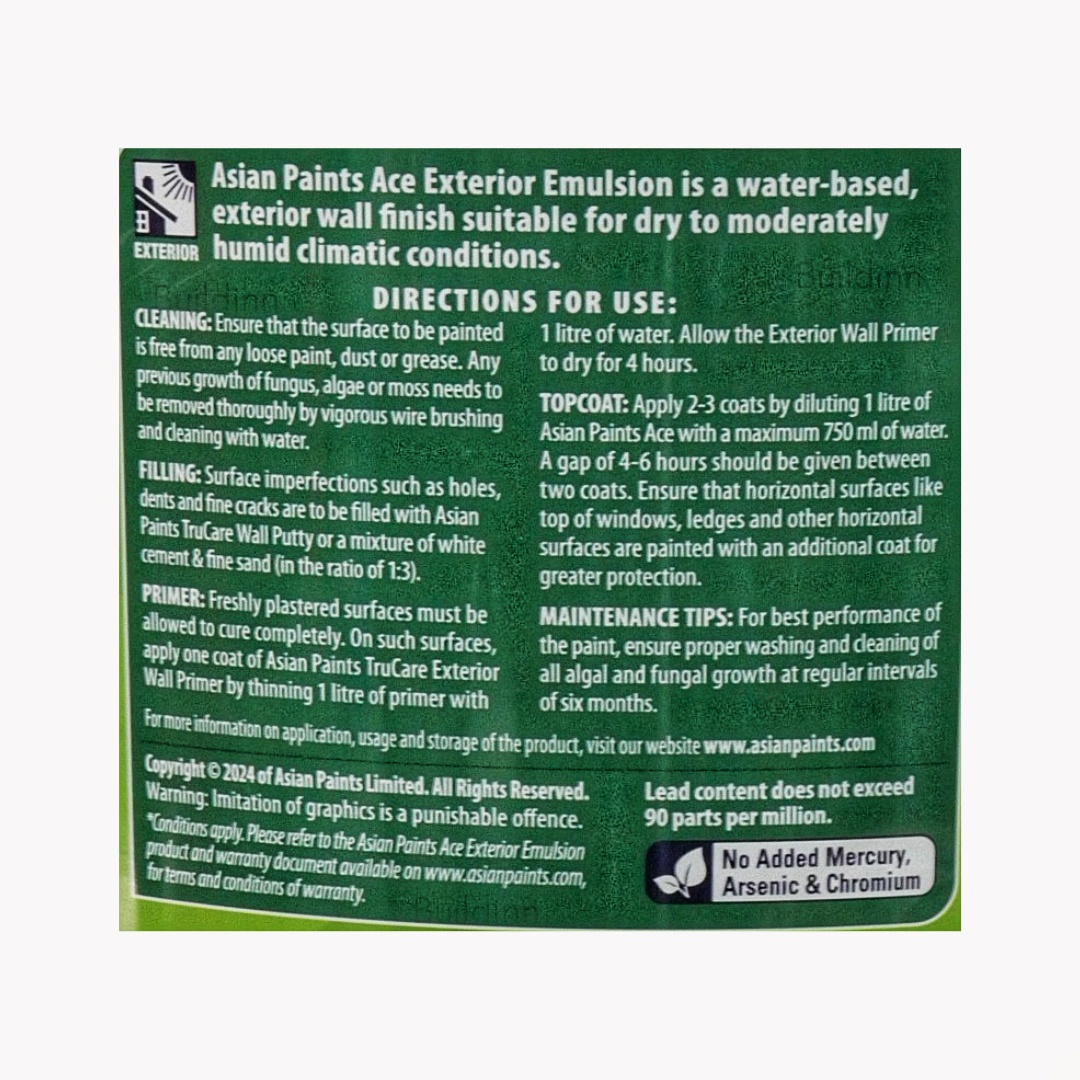 Asian Paints Ace exterior emulsion is a water-based paint designed for exterior walls, containing silicon additives and formulated for use in dry to moderately humid climates.