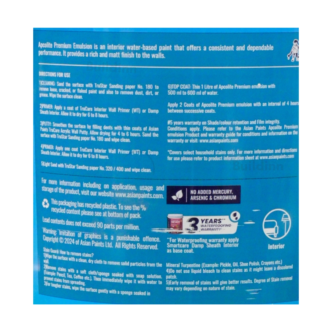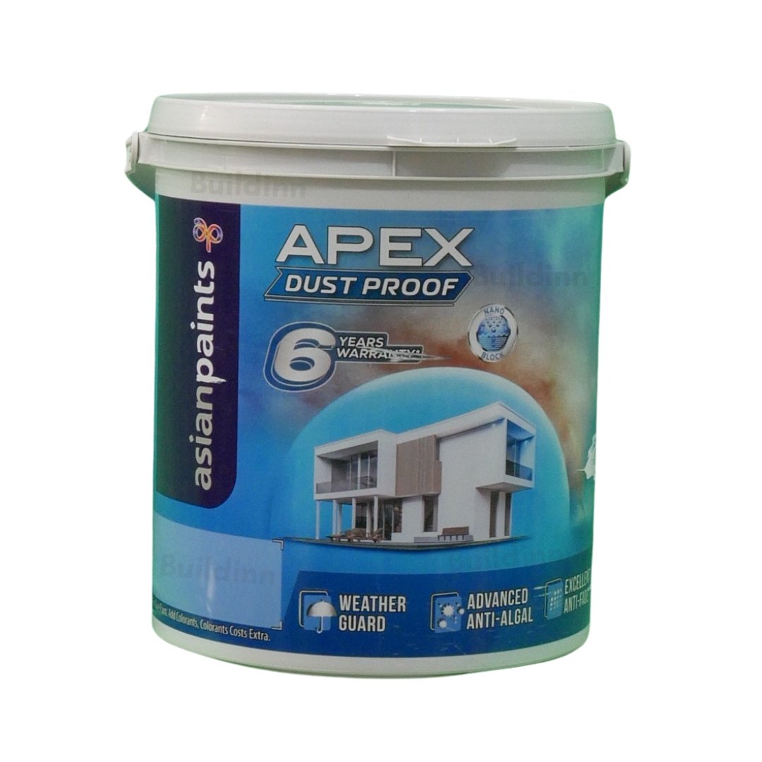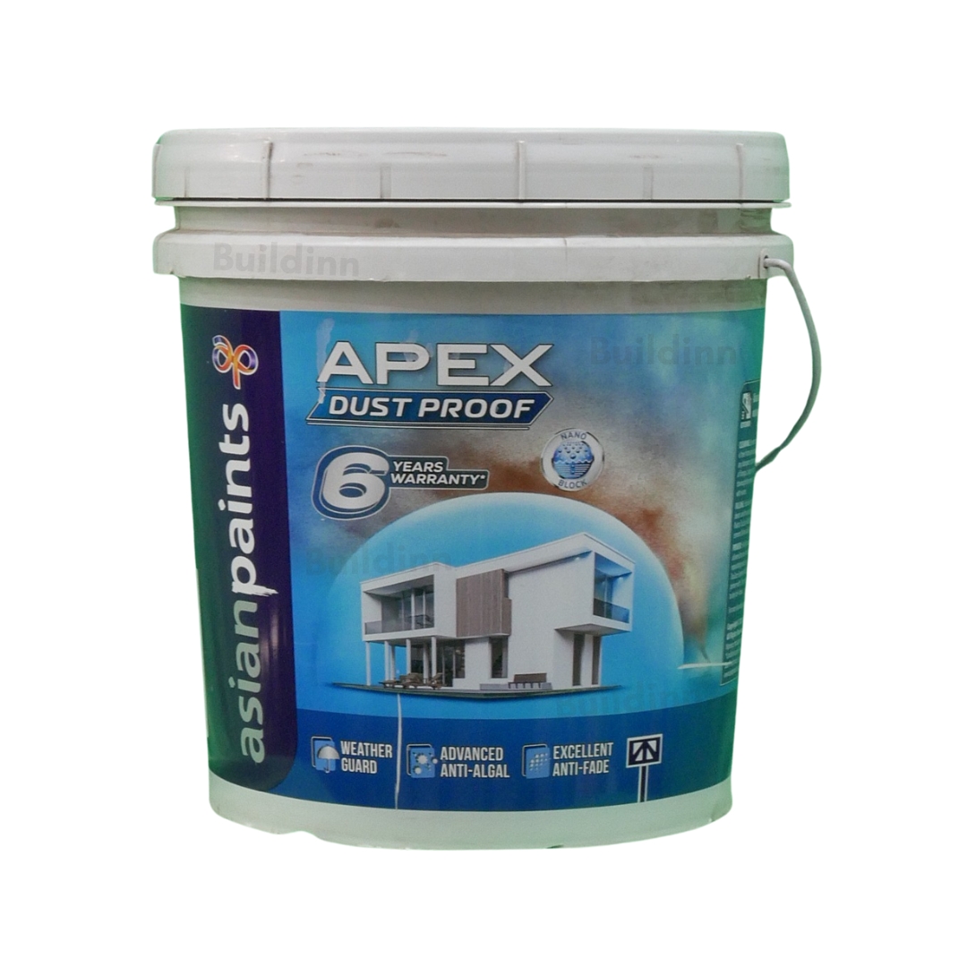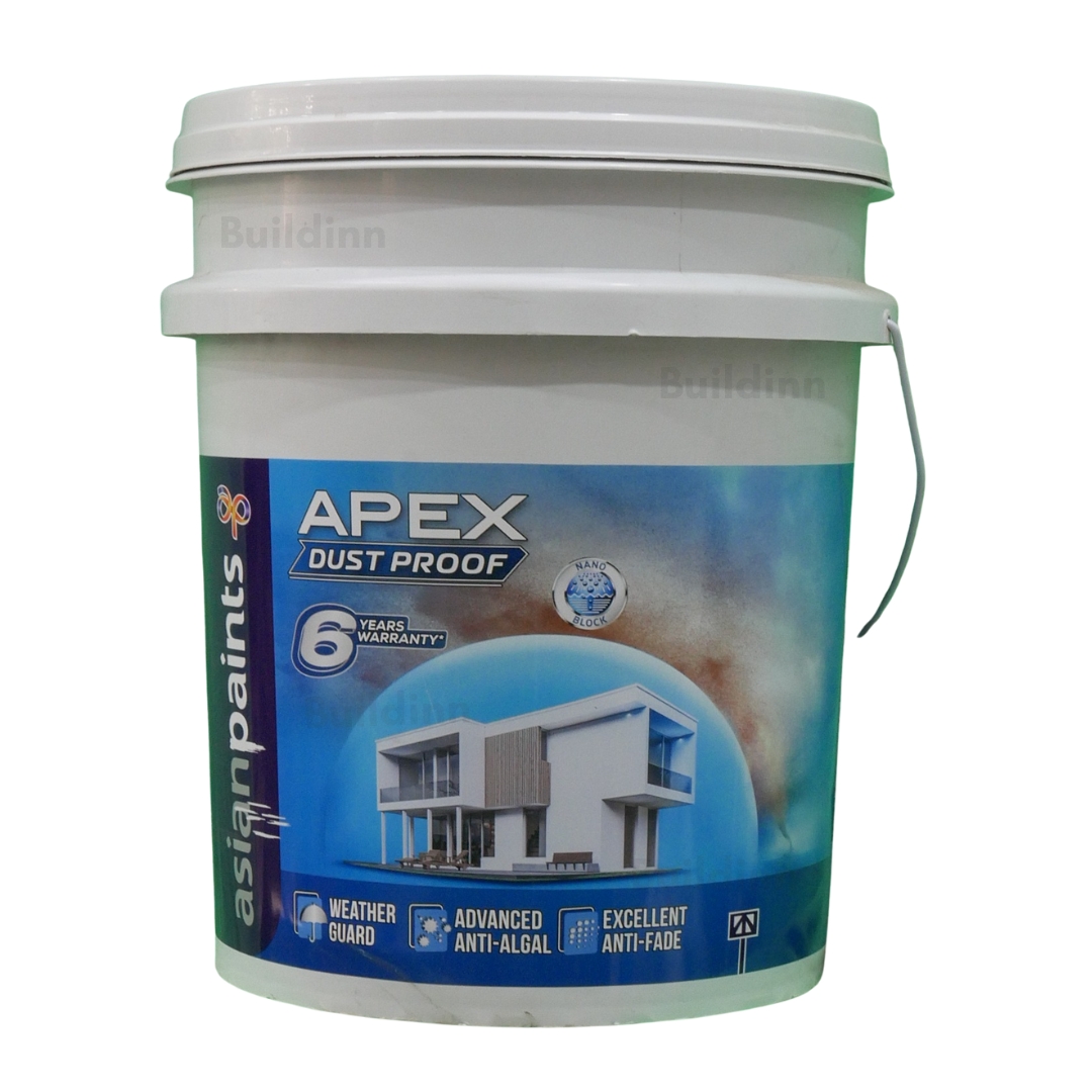 Asian Paints Apex Dust Proof Emulsion is a smooth, water-based exterior finish powered by Nano-Block technology, offering 6-year performance warranty. This advanced formula features Dust Proof Technology, which resists dust from settling on walls, ensuring long-term cleanliness. It also protects against harsh weather and algal attacks, maintaining the integrity of the paint film. Fortified with silicon additives, this modified acrylic finish is designed for exterior walls, providing exceptional durability and ease of maintenance.